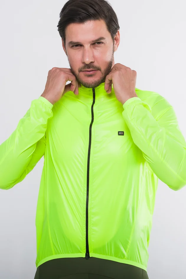 - Sistema Packable: A jaqueta é dobrável e pode ser armazenada dentro do seu próprio bolso interno, tornando-se ultra compacta para caber em qualquer bolso de jersey.